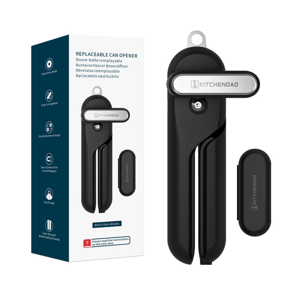 KITCHENDAO Replaceable Can Opener with 2 Extra Blades, Handheld Smooth Edge Cut Tin Opener, Super Sharp Manual Can Opener with Magnet, Large Turning Knob for Seniors & Arthritis, Black