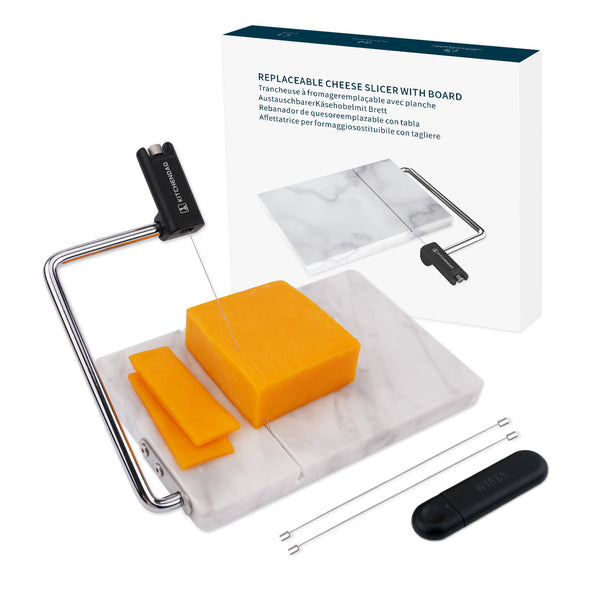 KITCHENDAO Replaceable Wire Cheese Slicer with Board, Tightness Adjustable Cheese Slicer, Marble Cheese Cutter for Block Cheese, Easy to Replace, with 2 Extra Upgrade Strong Wires